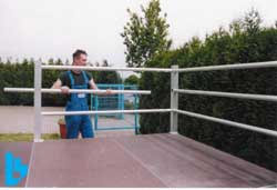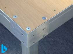 - Befestigung von Bühnengeländer seitlich, als auch von oben gem. DIN 4113 möglich, ohne Podeste mit Hülsen zu versehen,